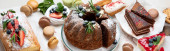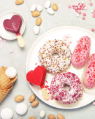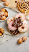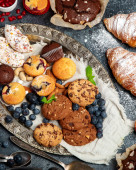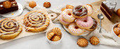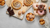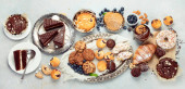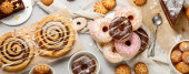 Asortyment deserów na jasnym tle. Świeżo upieczona piekarnia i przysmaki. Płaskie ułożenie, widok z góry, przestrzeń do kopiowania