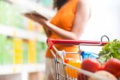 Kobieta sprawdzająca listę zakupów i kupująca towary w supermarkecie, jej koszyk jest pełny