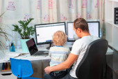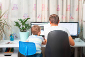 Zdjęcie "Ojciec z dzieckiem próbujący pracować w domu podczas kwarantanny. Zostań w domu, pracuj nad koncepcją domu podczas pandemii koronawirusowej" może być wykorzystywane do celów osobistych i komercyjnych zgodnie z warunkami zakupionej licencji Royalty-free. Obraz jest dostępny do pobrania w jakości wysokiej rozdzielczości do 5760x3840.