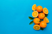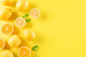Owocowe tło. Kolorowe świeże owoce na kolorowym stole. Pomarańczowy, cytrynowy, grejpfrutowy Przestrzeń dla tekstu zdrowej koncepcji. Płaskie ułożenie, widok z góry, przestrzeń do kopiowania.