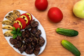 wysoki kąt widzenia smażonego mięsa na świeżej sałacie w pobliżu rozmazanych napojów na stole
