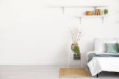 Wnętrze jasnej sypialni ze schodami, toaletą i pisankami
