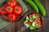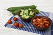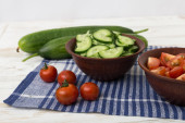 Świeże pomidory i sałatka ogórkowa w ciemnej misce i ręczniku kuchennym
