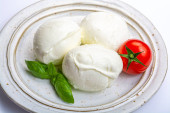 Biała kula włoskiego sera miękkiego Mozzarella di Bufala Campana serwowana ze świeżą zieloną bazylią i czerwonym pomidorem