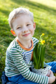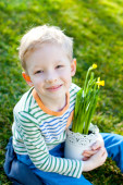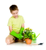 ładny, mały chłopiec, podlewanie kwiatów
