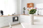 Zdjęcie "Stylowe wnętrze kuchni z pięknymi kwiatami" może być wykorzystywane do celów osobistych i komercyjnych zgodnie z warunkami zakupionej licencji Royalty-free. Obraz jest dostępny do pobrania w jakości wysokiej rozdzielczości do 5760x3840.