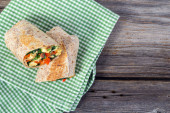 Naleśniki ze szpinakiem, fetą i suszonymi pomidorami. Podano na szarym talerzu. Drewniane naturalne tło.