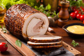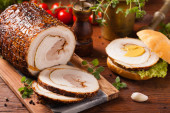 Całą bekonową rouladę. Podawany w plasterkach mięsa z białym sosem. Widok z przodu.