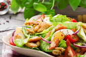 Zdjęcie "Pyszna sałatka z bób i kurczaka. Służył w misce na niebieskim tle malowane." może być wykorzystywane do celów osobistych i komercyjnych zgodnie z warunkami zakupionej licencji Royalty-free. Obraz jest dostępny do pobrania w jakości wysokiej rozdzielczości do 5760x3840.