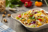 Włoska sałatka z tuńczyka z ryżem, oliwkami i kaparami. Widok góry. Naturalne drewniane tło.