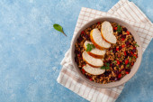 Zdjęcie "Modny obiad z czerwonym ryżem, mieszanka kaszy i warzyw. Z przodu. Podawany w białej misce na szarym drewnianym tle. " może być wykorzystywane do celów osobistych i komercyjnych zgodnie z warunkami zakupionej licencji Royalty-free. Obraz jest dostępny do pobrania w jakości wysokiej rozdzielczości do 5760x3840.
