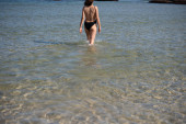 Seksowny młody kaukaski kobieta model w bikini stwarzające na plaży nad morzem.