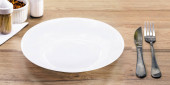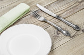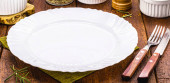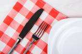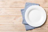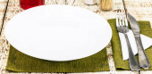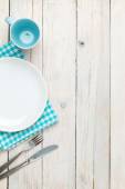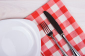 górny widok rustykalny biały stół makieta, puste okrągłe i białe talerze do jedzenia, sztućce na stronie, vintage tło, domowej roboty koncepcji żywności