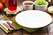 Zdjęcie "górny widok rustykalny biały stół makieta, puste okrągłe i białe talerze do jedzenia, sztućce na stronie, vintage tło, domowej roboty koncepcji żywności" może być wykorzystywane do celów osobistych i komercyjnych zgodnie z warunkami zakupionej licencji Royalty-free. Obraz jest dostępny do pobrania w jakości wysokiej rozdzielczości do 5760x3840.