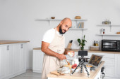 Przystojny człowiek cięcia brzoskwinia podczas gotowania wideo samouczek w kuchni
