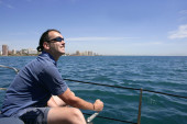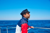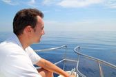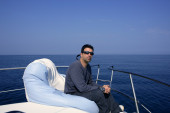 zrelaksowany człowiek na dziobie łodzi na worek fasoli