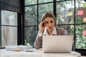 Portret pięknej młodej azjatki pracującej na laptopie w miejscu pracy.
