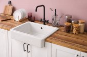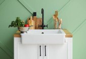 Zdjęcie "Biały zlewozmywak z rośliną domową, naczynia kuchenne i spożywcze na licznikach w pobliżu zielonej ściany" może być wykorzystywane do celów osobistych i komercyjnych zgodnie z warunkami zakupionej licencji Royalty-free. Obraz jest dostępny do pobrania w jakości wysokiej rozdzielczości do 5760x3840.