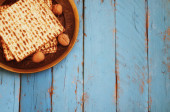 Matzah, czerwone koszerne i orzechowe. Tradycyjny rytuał żydowski chleb na starym drewnianym rustykalnym tle. Jedzenie paschalne. Pesach żydowskie święto koncepcji obchodów Paschy.