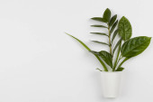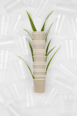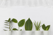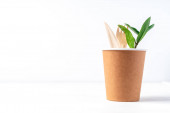 kubek ekologiczny wielokrotnego użytku i gałęzie roślin w rękawie swetra na białym tle. Zrównoważony styl życia