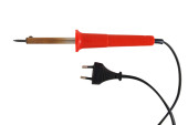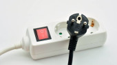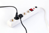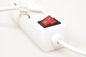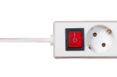 Listwa zasilająca z wyłącznikiem i trzema wtyczkami elektrycznymi izolowanymi na białym tle