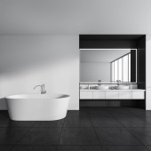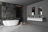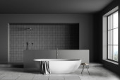 Ciemne wnętrze łazienki z wanną, stołek z ręcznikami, prysznic, dywan, szare ściany, okno w odbiciu, betonowa podłoga. Koncepcja higieny i zabiegów uzdrowiskowych dla zdrowia. 3d renderowanie