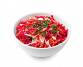 Letnia sałatka witaminowa z burakami, kapustą i marchewką na jasnoszarym tle.