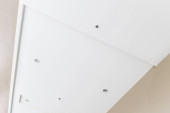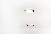 Domowa wentylacja mechaniczna z odzyskiem ciepła, widoczny anemostat spalin na suficie w pomieszczeniu, szara ściana