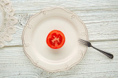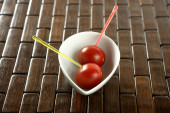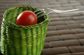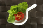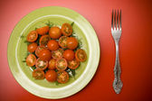czerwone pomidory cherry oddział, łyżka i zielony danie