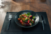 Talerz smacznej sałatki wegańskiej Cezar na czarnym tle