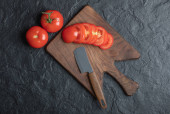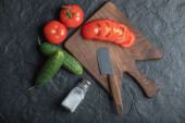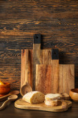 Drewniane deski do krojenia, szpachelka i papryka na stole przy lekkiej ścianie