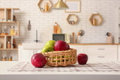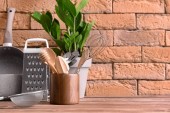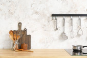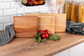 Drewniane deski do krojenia i cebula na stole przy ścianie z cegły