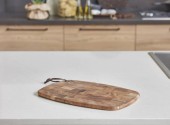 Drewniane deski do krojenia i chleb na stole przy ścianie płytek