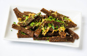 Talerz ze smacznymi grzankami i sosem na białym tle