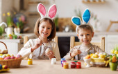 Dwie pozytywne dziewczynki z króliczymi uszami uśmiechnięte i trzymające wielkanocny koszyk w rękach w domu