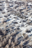 Sezonowy charakter Zimowych obraz: krajobraz górski z drzew (ciemne sylwetki) o zejście snowy mountain (nachylenie) wzorkiem pni i cienie. Może służyć jako pocztówki, tło lub tapeta.