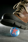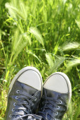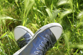 srebrny komputerowe przewodowe myszy pomiędzy butów sportowych
