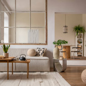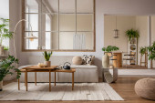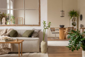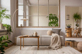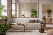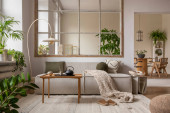 Zdjęcie "Stylowy kompozytor nowoczesnego salonu z beżową sofą, abstrakcyjnym malowaniem, drewnianą toaletą, stołem bocznym i eleganckimi akcesoriami domowymi. Domowa inscenizacja. Szablon. Przestrzeń kopiowania." może być wykorzystywane do celów osobistych i komercyjnych zgodnie z warunkami zakupionej licencji Royalty-free. Obraz jest dostępny do pobrania w jakości wysokiej rozdzielczości do 5760x3840.