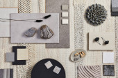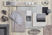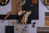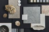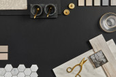 Zdjęcie "Kreatywna płaska kompozycja z próbkami tekstylnymi i malarskimi, panelami i płytkami. Stylowa deska nastrojowa projektanta wnętrz. Różowa, czarna i jasnoszary kolor palety. Odbiór. Wzór. " może być wykorzystywane do celów osobistych i komercyjnych zgodnie z warunkami zakupionej licencji Royalty-free. Obraz jest dostępny do pobrania w jakości wysokiej rozdzielczości do 5760x3840.
