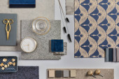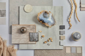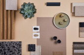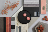 Kreatywna płaska kompozycja z próbkami tekstylnymi i malarskimi, panelami i płytkami. Stylowa deska nastrojowa projektanta wnętrz. Różowa, czarna i jasnoszary kolor palety. Odbiór. Wzór.