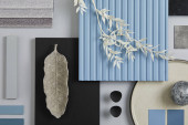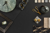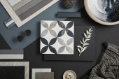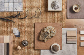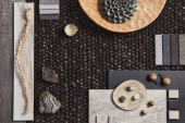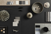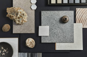 Elegancka płaska kompozycja wnętrza designerskiej płyty nawilżającej z próbkami tekstylno-malarskimi, panelem lamelowym i płytkami. Czarna, beżowa i szara paleta kolorów. Odbiór. Wzór