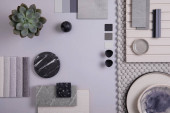 Zdjęcie "Elegancka płaska kompozycja wnętrza designerskiej płyty nawilżającej z próbkami tekstylno-malarskimi, panelem lamelowym i płytkami. Czarna, beżowa i szara paleta kolorów. Odbiór. Wzór" może być wykorzystywane do celów osobistych i komercyjnych zgodnie z warunkami zakupionej licencji Royalty-free. Obraz jest dostępny do pobrania w jakości wysokiej rozdzielczości do 5760x3840.