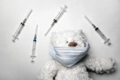 Miś na lekarza, strzykawka szczepionki krwawe na jej ramieniu
