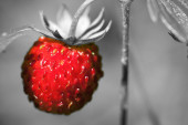 Zdjęcie "Natura obraz środowiska eco: kolorowy czerwony dziki truskawkowy berry blisko up który rośnie wśród innych roślin w lesie z czarno-białe tło bezbarwny. Mogą być używane jako tapetę." może być wykorzystywane do celów osobistych i komercyjnych zgodnie z warunkami zakupionej licencji Royalty-free. Obraz jest dostępny do pobrania w jakości wysokiej rozdzielczości do 5760x3840.