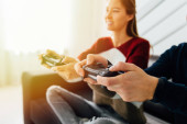 Zdjęcie "Przyjaciele grający w gry wideo w domu. Gracze trzymający gamepady siedzące przed ekranem. Serpentyny dziewczyna i chłopiec gra online w ciemnym pokoju oświetlone przez neony. Konkurencja i zabawa" może być wykorzystywane do celów osobistych i komercyjnych zgodnie z warunkami zakupionej licencji Royalty-free. Obraz jest dostępny do pobrania w jakości wysokiej rozdzielczości do 5760x3840.