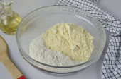 Mąkę żytnią wymieszać z solą, cukrem i proszkiem do pieczenia.