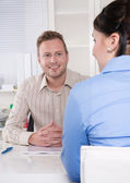 dwa biznes kobieta siedzi przy biurku: klienta i doradcy mówią