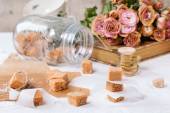 Zamknij azjatycki tradycyjny deser ryżowy słodki zielony matcha mochi w różowym naczyniu ceramicznym na niebieskim stole. Wiosna różowe kwiaty na tle.