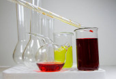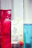 laboratorium rzeczy, szklanego cylindra, kolorowych płynów