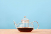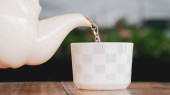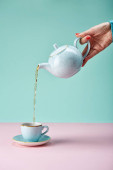 Biały czajnik wlewa herbatę do filiżanki, która jest w jego ręce na turkusowym tle niebieskim. Minimalny skład układu.
